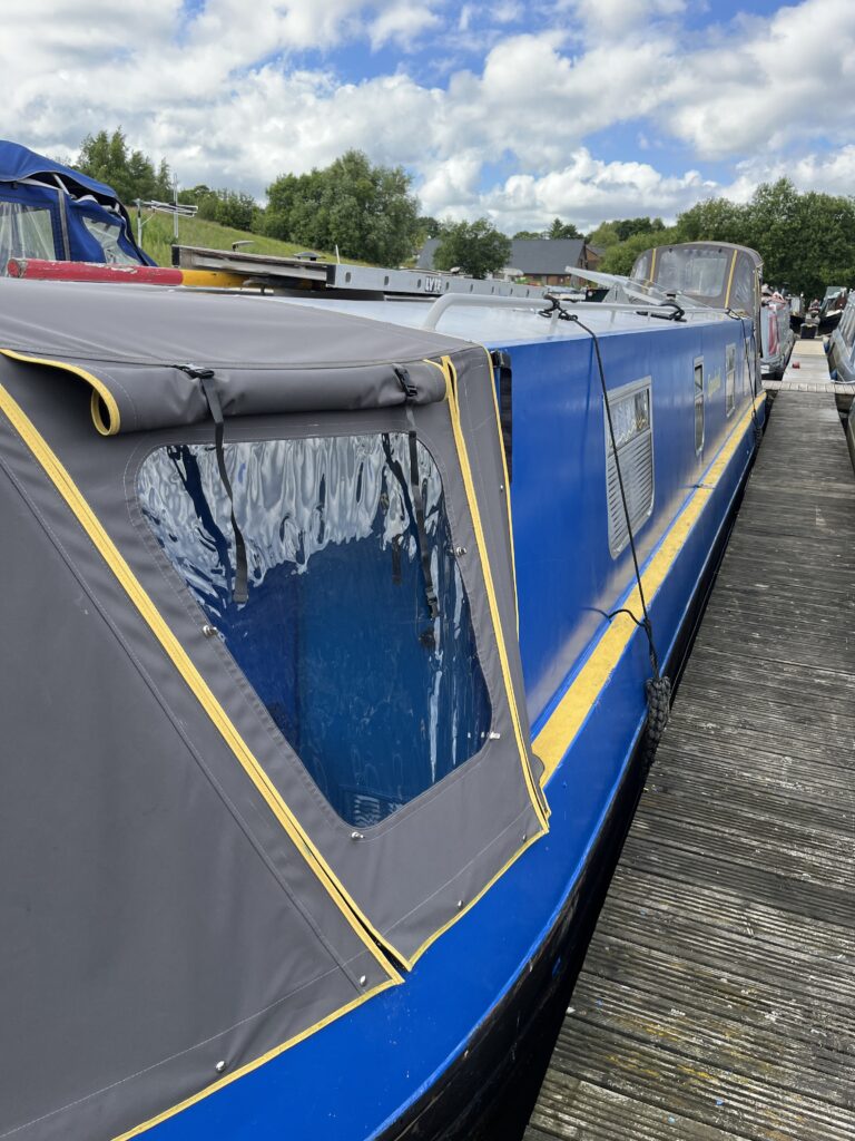 Pram canopy and cratch hood by Amtrim fitted 2022. Solar panels fitted by Onboard Solar 2022.