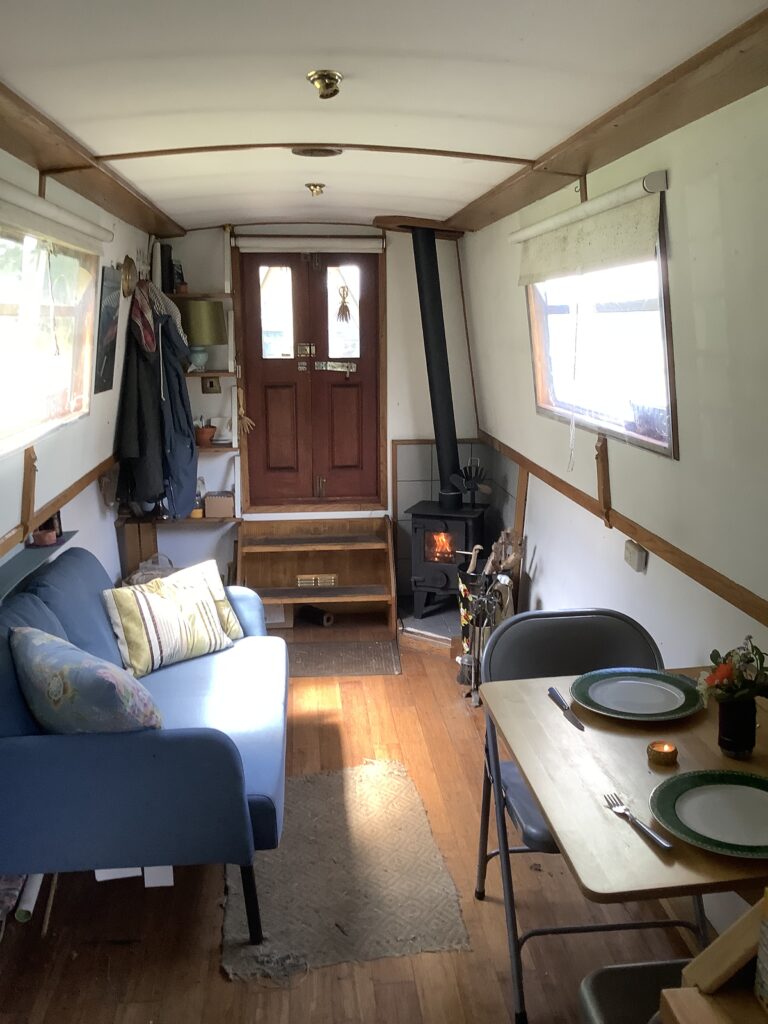 Through the secure double front doors down steps to the saloon, with cosy Boatman woodstove, IKEA sofa, fold-down dining table and chairs.