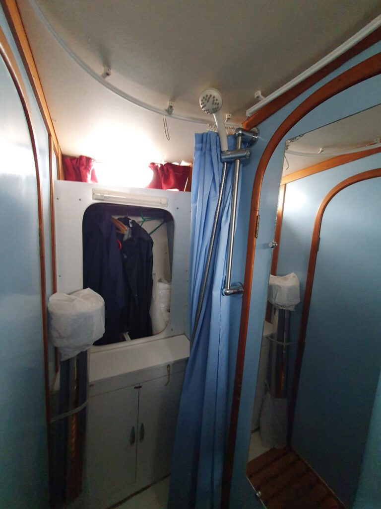 The galley has a two-burner hob, grill, and oven, a microwave oven, and also boasts hot and cold pressurised water. There is a large 12v fridge with icebox. She even has a washing machine on board.